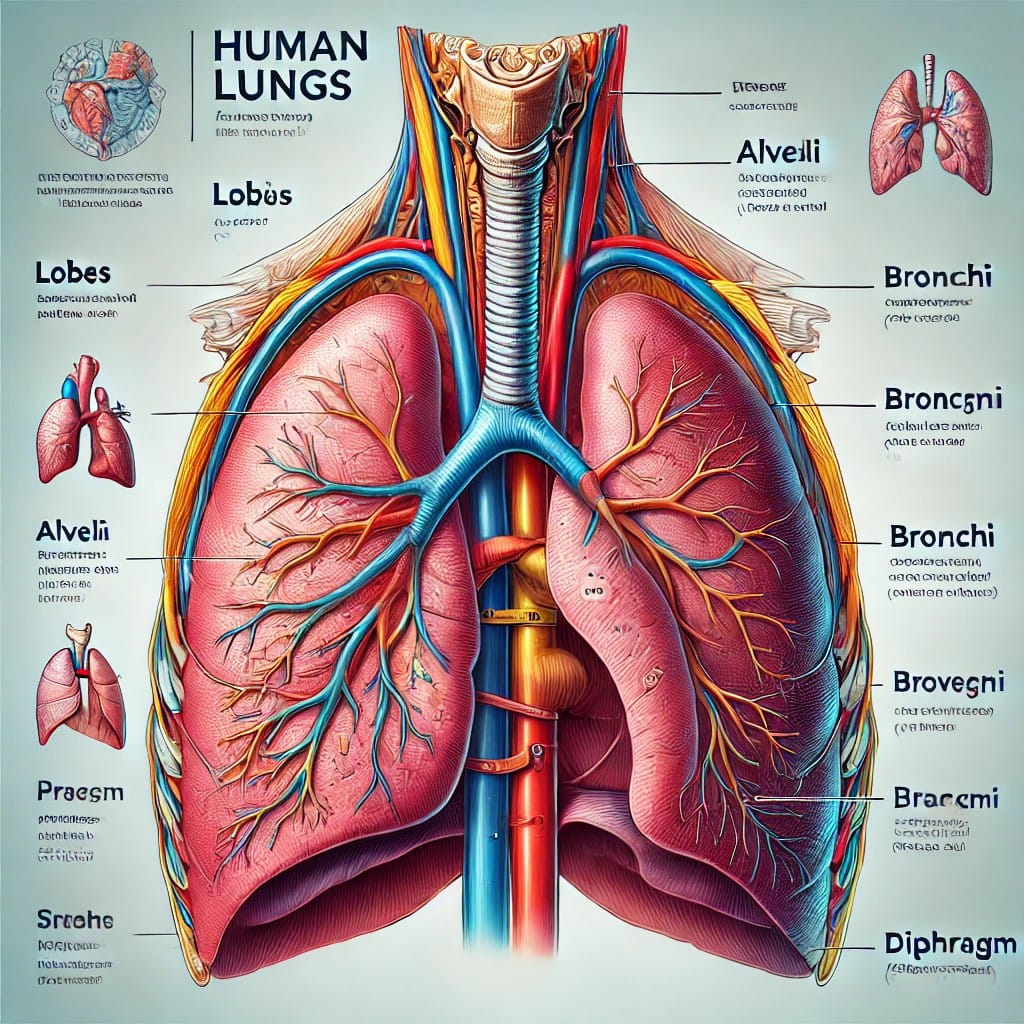 İnsan vücudunda iki akciğer bulunur, biri sağda diğeri soldadır. Sağ akciğer üç lobdan, sol akciğer ise iki lobdan oluşur. Sol akciğerin biraz daha küçük olmasının nedeni, kalbin sol tarafta yer almasıdır. Akciğerler, süngerimsi bir yapıya sahip olup, yüzeylerinde milyonlarca küçük hava keseciği olan alveoller bulunur. Bu alveoller, oksijenin kanda taşınabilmesi için kana geçmesini sağlayan yerlerdir. Ayrıca, karbondioksitin kana geçip atılmasını sağlayan yapılar da alveollerde bulunur.