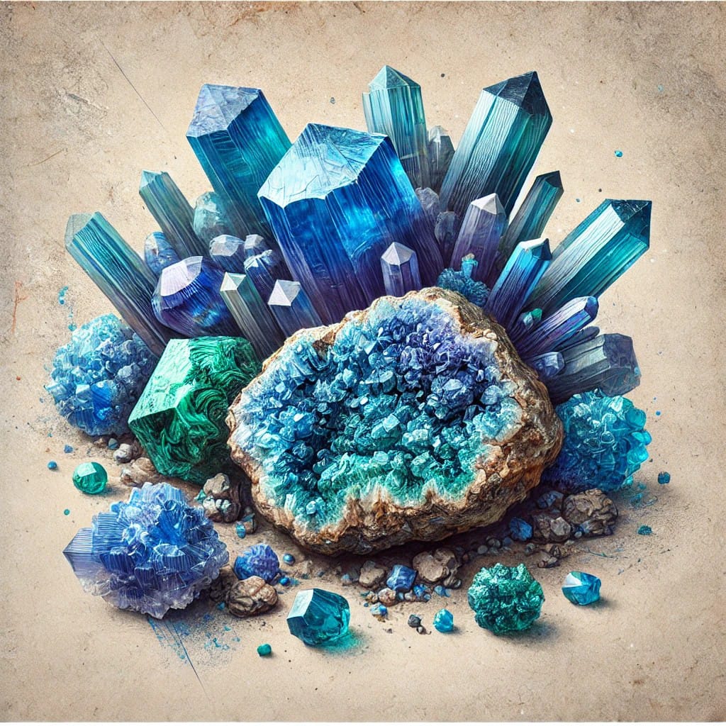 Azurit, bakır içeren karbonat minerallerinden biridir ve canlı mavi tonlarıyla dikkat çeker. Adını, Persçe “mavi” anlamına gelen lazhward kelimesinden almıştır. Azurit, doğada genellikle malakit ve kuprit gibi diğer bakır mineralleriyle birlikte bulunur. Mineralin parlak mavi rengi, hem estetik hem de kimyasal özelliklerinden kaynaklanır ve onu mücevher, dekorasyon ve metafizik uygulamalarda popüler bir taş haline getirir.