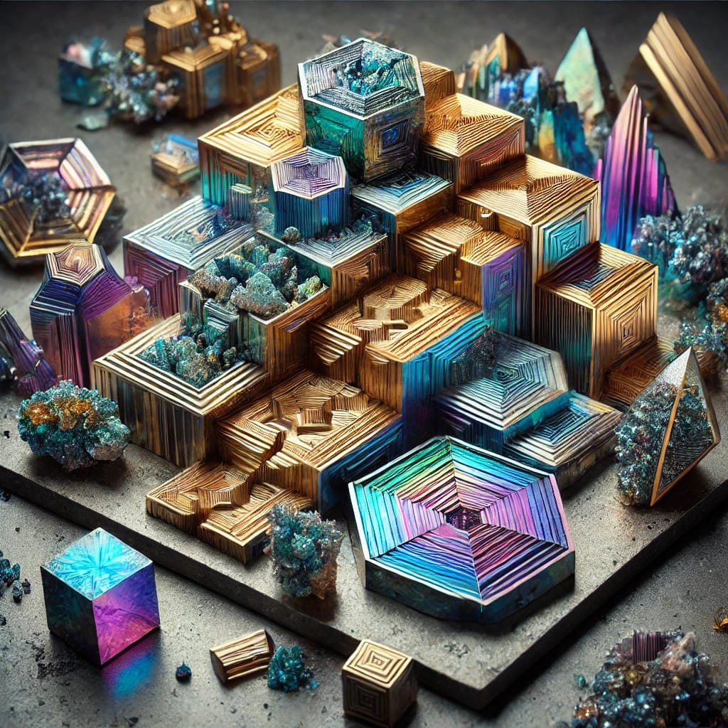Bismut, doğal olarak oluşan, genellikle metalik bir görünümü olan ve karmaşık geometrik yapılarıyla bilinen bir kristal türüdür. Gökkuşağı renklerini andıran yüzey desenleriyle tanınır ve eşsiz görünümü sayesinde koleksiyoncular ve tasarımcılar arasında popülerdir. Doğada serbest halde nadiren bulunur ve genellikle başka minerallerle birleşik halde rastlanır.