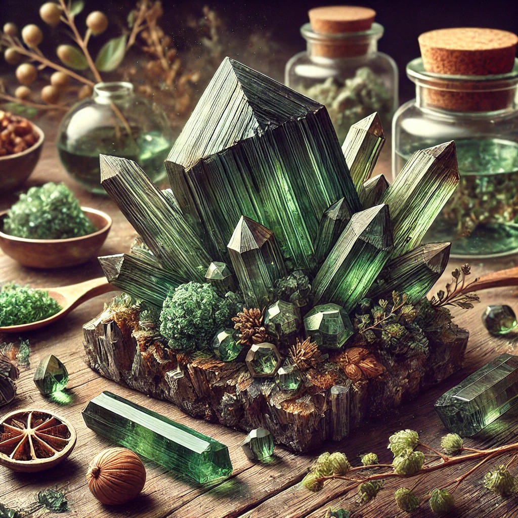 - Kristal yapısı, ince prizmatik formları ve zeytin yeşili renkleriyle benzersiz bir görünüme sahiptir.