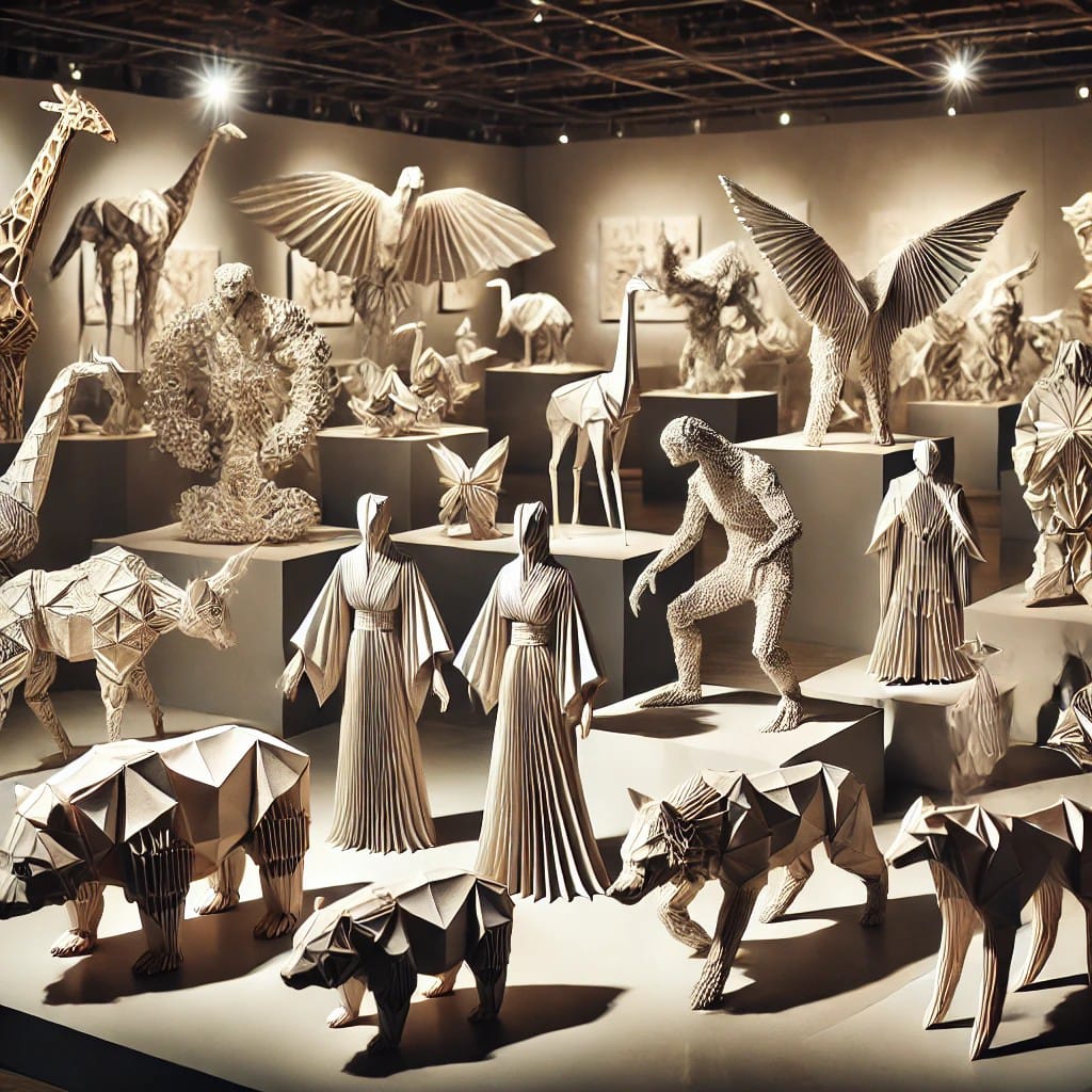 - Sanat Galerileri ve Heykel Sergileri: Origami’den yapılan heykeller, sanat galerilerinde ve müzelerde sergilenmektedir. Bu heykeller, sadece görsel olarak etkileyici olmakla kalmaz, aynı zamanda kağıdın ve katlamanın sanatsal gücünü gösteren derin anlamlar taşır. Origami heykelleri, çoğu zaman doğal formları yansıtır ve estetik değerlerinin yanı sıra, izleyiciye yaratıcı düşünmeyi ve hayal gücünü harekete geçirmeyi amaçlar.